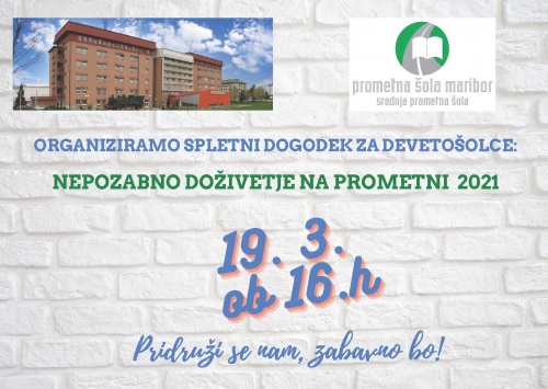 V petek, 19. 3. 2021 bomo izvedli dogodek Nepozabno doživetje na Prometni šoli Maribor. Vsi, ki ste se prijavili preko prijavnega obrazca, ste bili obveščeni preko elektronske pošte, kamor ste dobili tudi povezavo na srečanje v aplikaciji ZOOM.