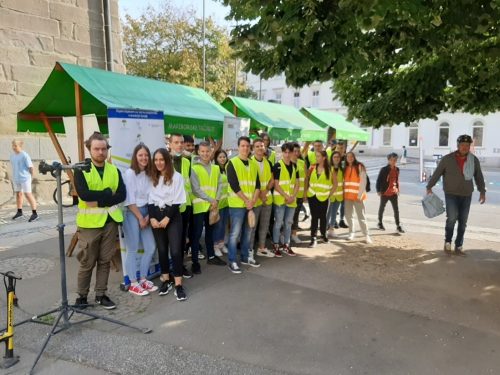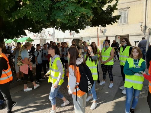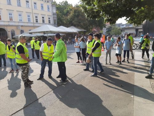 - Skupinska fotografija dijakov, ki so sodelovali v akciji Drugače na pot – v šolo s kolesom, na Trgu svobode v Mariboru.