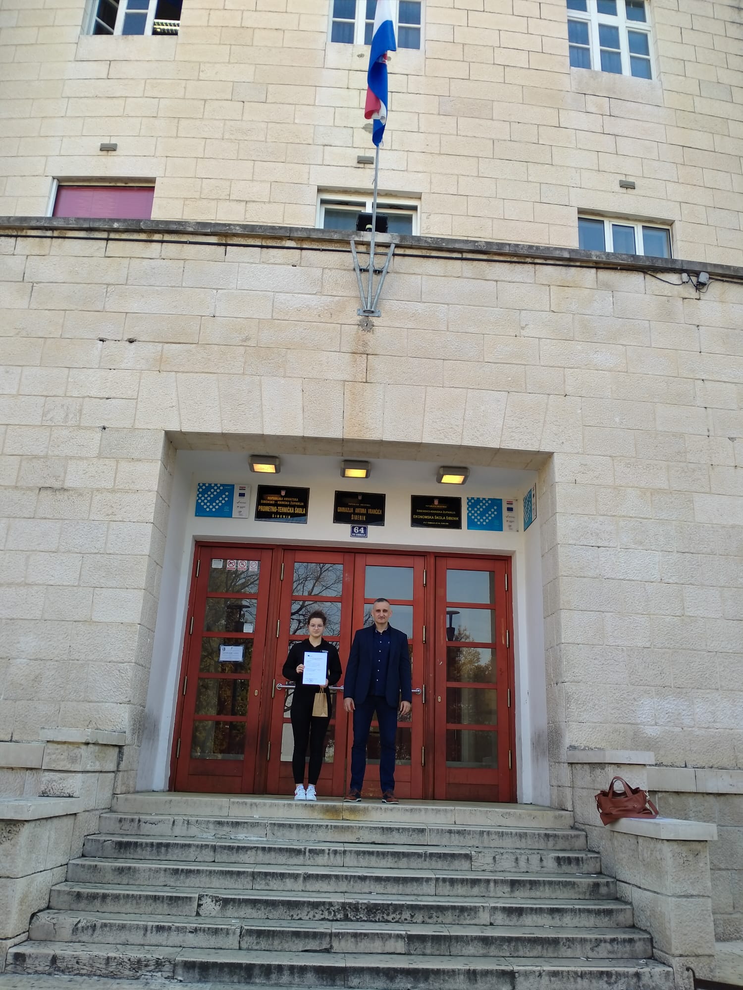Dijakinja 4. b razreda se je med 11. 3. in 22. 3. udeležila mobilnosti v Šibeniku z namenom spoznavanja stroke, ki jo želi tudi v prihodnje študirati na Fakulteti za pomorstvo in promet v Portorožu. Dijakinja je sodelovala pri pouku in praktičnem pouku  v Prometno-tehnički školi v Šibeniku, ki izvaja program pomorstva. Bila je vključena v  4. c razred, ki se usposablja za bodoče pomorščake. Šola dijakom nudi praktični pouk na šolski ladjici in na  navtičnih simulatorjih. Vse to je  tudi sama  preizkusila in spoznala, na kakšen način se manevrira z ladjo. Veliko je bilo dela s pomorskimi kartami, kjer je veliko merjenja razdalj v miljah, računanja in podobnega. Najpomembnejši in najzahtevnejši  so se ji zdeli predmeti navigacije.