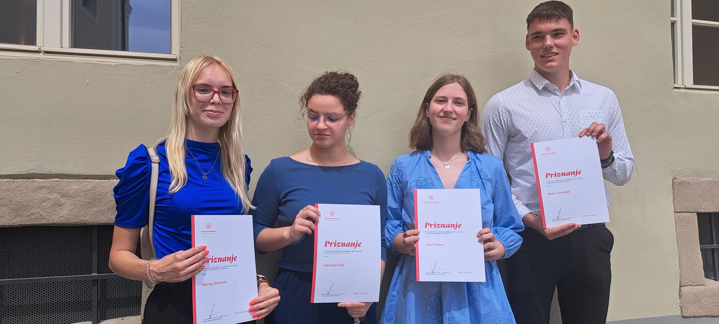 Včeraj, 20. 6. 2024, je v organizaciji Mestne občine Maribor potekala slovesna podelitev priznanj osnovnošolcem in dijakom za odličen uspeh v vseh letih šolanja. Na povabilo župana MOM Saša Arsenoviča so se slovesnosti udeležili tudi naši dijaki Glorija Šerbinek (4. BL), Viktorija Ferš (4. BV), Zala Predan (4. BL) in Boris Lozinšek (4. BL).