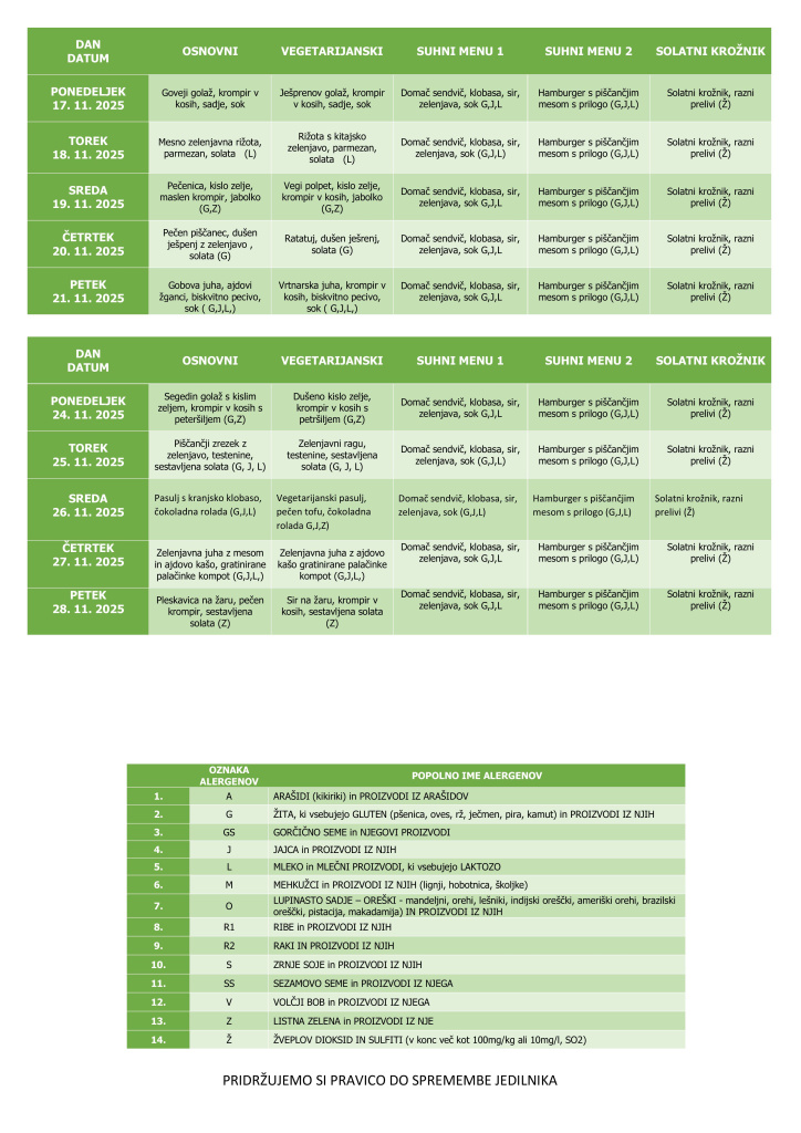 Na razpolago ima 8 menijev. Registrator za spremembo menija, odjavo in naknadno prijavo je v jedilnici.