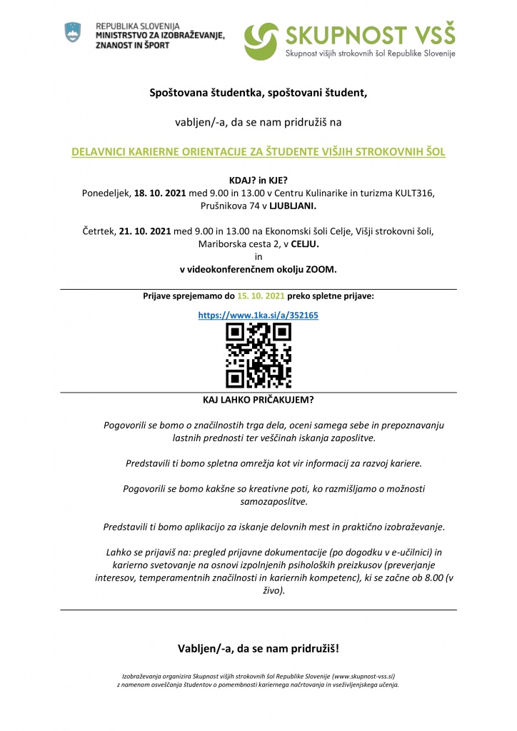 Vabimo vas, da se udeležite delavnice Karierna orientacija, na kateri boste imeli tudi možnost individualnega kariernega svetovanja na osnovi izpolnjenih psiholoških preizkusov (vabilo in prijavnica sta spodaj, ob prijavi ustrezno označite).