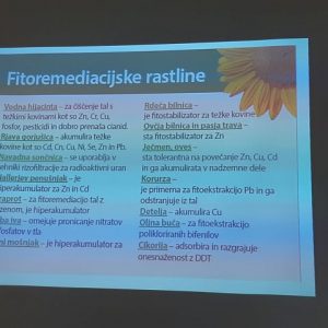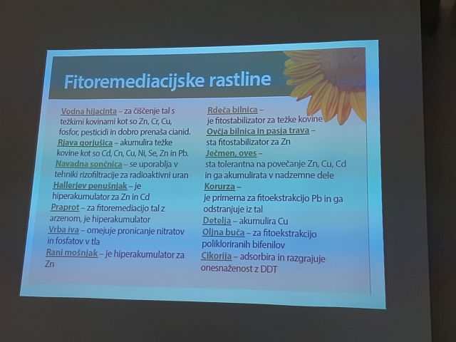 Na današnjem strokovnem predavanju, ki ga je izvedla ddr. Ana Vovk Korže, smo študenti in zaposleni spoznali pomen ekosistemskega pristopa za varovanje narave pred onesnaženji, saj le-ta olajša obrambno sposobnost okolja, ki se je razvijala skozi tisočletja. Za nemoteno delovanje ekosistemov ob današnjem nenehnem obremenevanju okolja so dobrodošle rešitve, ki jih omogočajo ekoremediacijske metode – to je ponovna oživitev že degradiranih območij na naravni način, prav tako pa imajo preventivno vlogo za preprečevaje novih problemov v okolju. Na tem principu so zasnovane tudi ekoremediacije. Narava je že davno znala sama uravnavati svoj razvoj za razliko od človeka, ki je s svojimi posegi vanjo otežil ta milijone let star proces. Za večjo uporabo teh metod je potrebno informiranje in izobraževanje, ki omogoča razumevanje delovanja narave in njenih procesov.