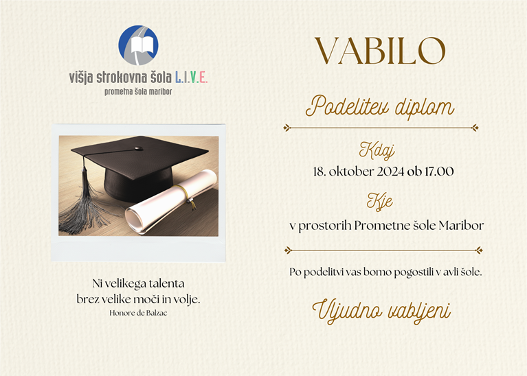 Vabljeni na svečano podelitev diplom, ki bo v petek, 18. 10. 2024, ob 17.00 uri na Prometni šoli Maribor (več o dogodku bo v vabilu in navodilih, ki jih boste prejeli po e-pošti).