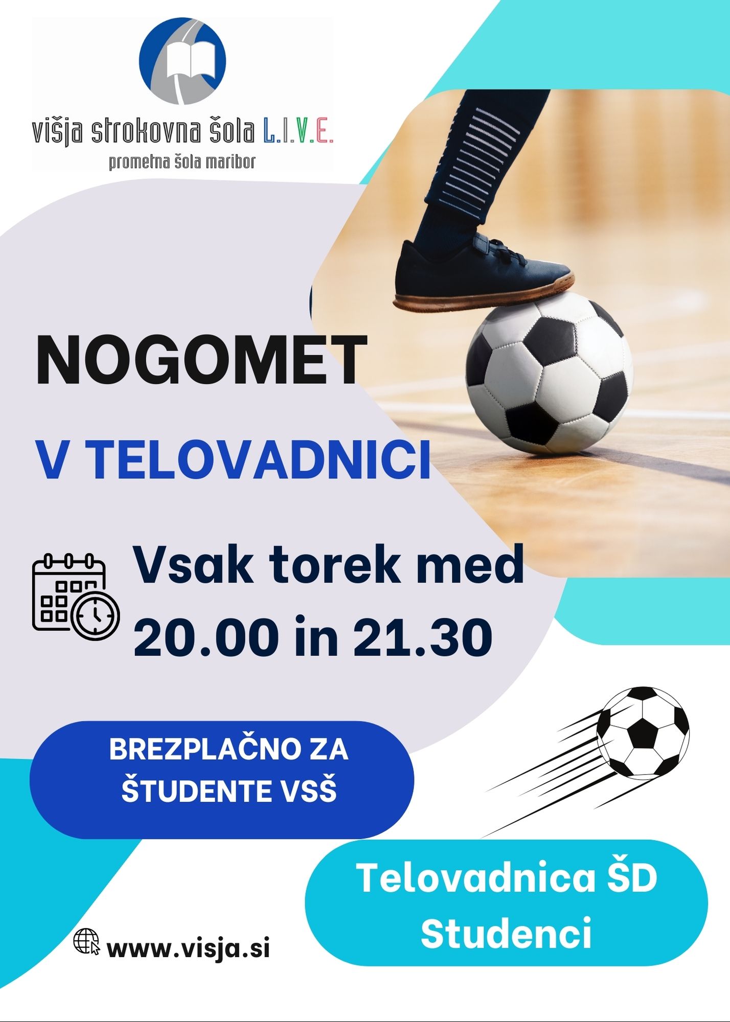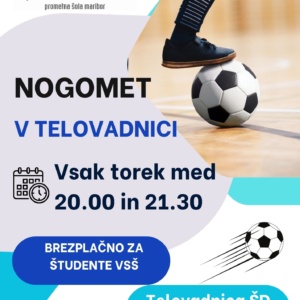 Šport na VSŠ L.I.V.E. Študenti in študentke VSŠ L.I.V.E.! Vabimo vas k brezplačni vadbi (nogomet, fitnes) po urniku: