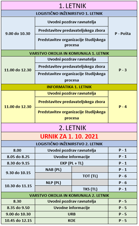 Študente in študentke rednega študija Višje prometne šole Maribor obveščamo, da pričenjamo s študijskim procesom na Višji prometni šoli v petek, 1. 10. 2021, po naslednjem urniku: