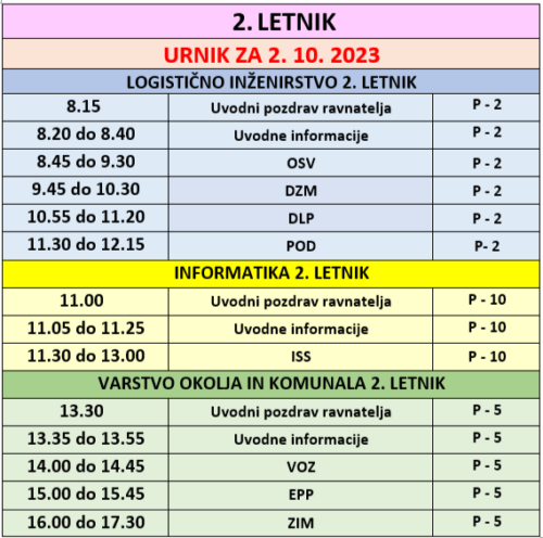 Obveščamo vas, da pričnete s študijskim procesom v študijskem letu 2023/2024 v ponedeljek, 2. 10. 2023, po naslednjem urniku: