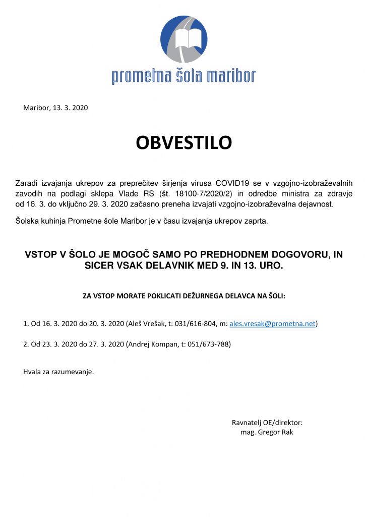 Obvestilo – vstop v šolo od 16. 3. do 29. 3. 2020