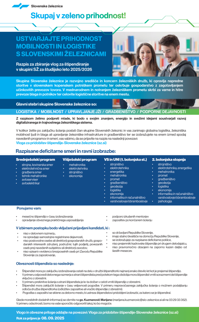SLOVENSKE ŽELEZNICE – kadrovske štipendije Pridobite kadrovsko štipendijo Slovenskih železnic – rok je 8. 9. 2025. Razpis je na povezavi TUKAJ.