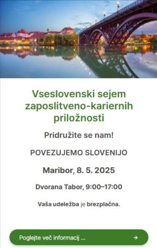 Zavod RS za zaposlovanje vabi na sejem zaposlitveno-kariernih priložnosti v četrtek, 8. 5. 2025, v Dvorano Tabor – več o sejmu lahko preberete TUKAJ.